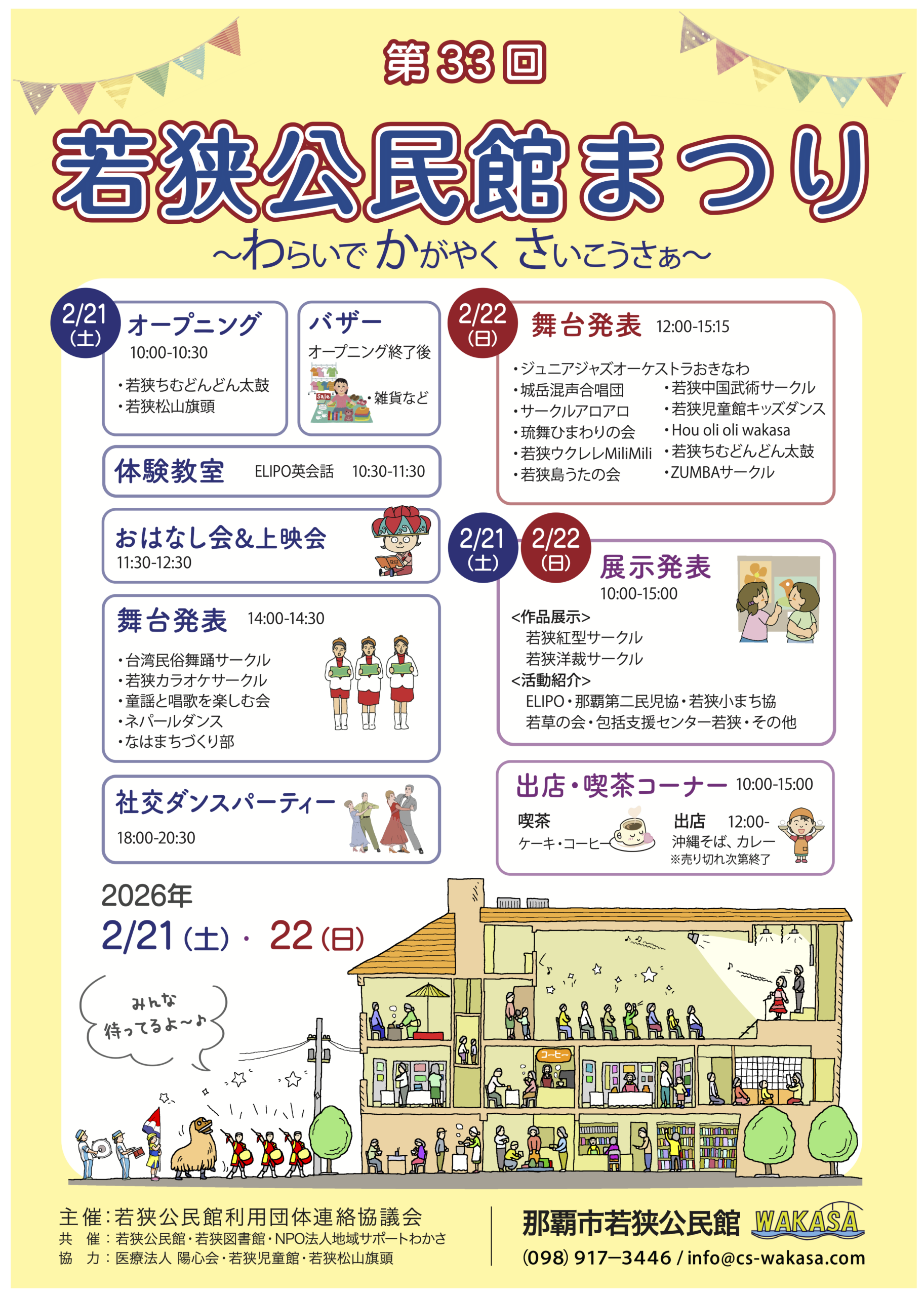 第33回 若狭公民館まつり 2026.03.02 若狭公民館を定期的に利用しているサークルの皆さんが、日頃の活動の成果を発表する場として開催しているおまつりです。 舞台発表・展示発表をはじめ、体験教室、出店、喫茶コーナーなど、見て・聴いて・体感して楽しめる内容が盛りだくさん! 子どもから大人まで、どなたでも気軽にお楽しみいただけます。ぜひ、おこしください。 【日時】2月21日(土)・22日(日)10時〜15時【場所】若狭公民館
