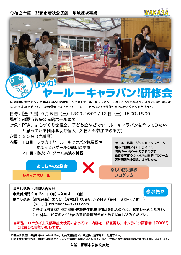 5月22日(日)に曙公園にて『リッカ!ヤールーキャラバン』を開催します。 曙小学校区まちづくり協議会が主催となり、若狭公民館も地域連携事業としてお手伝いします。 事前研修も昨年度に行いましたが、ボランティア...