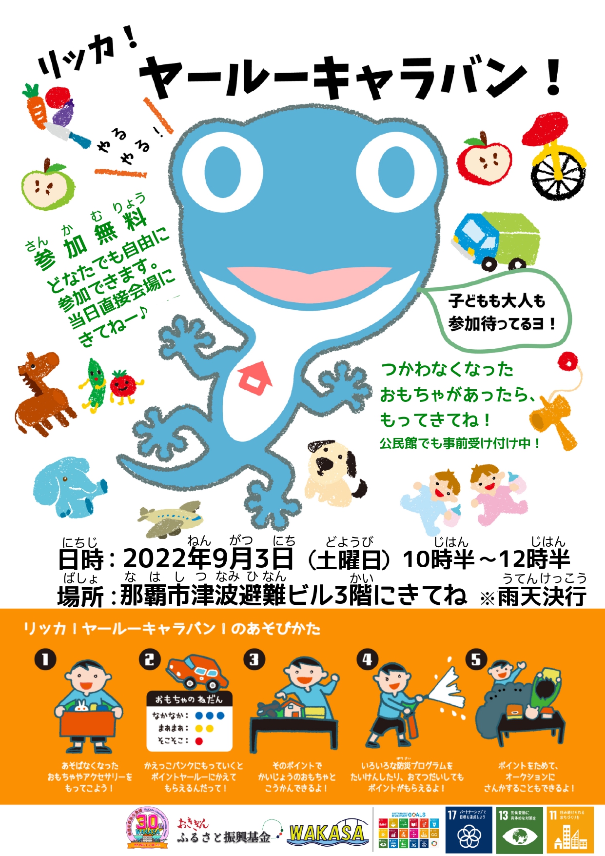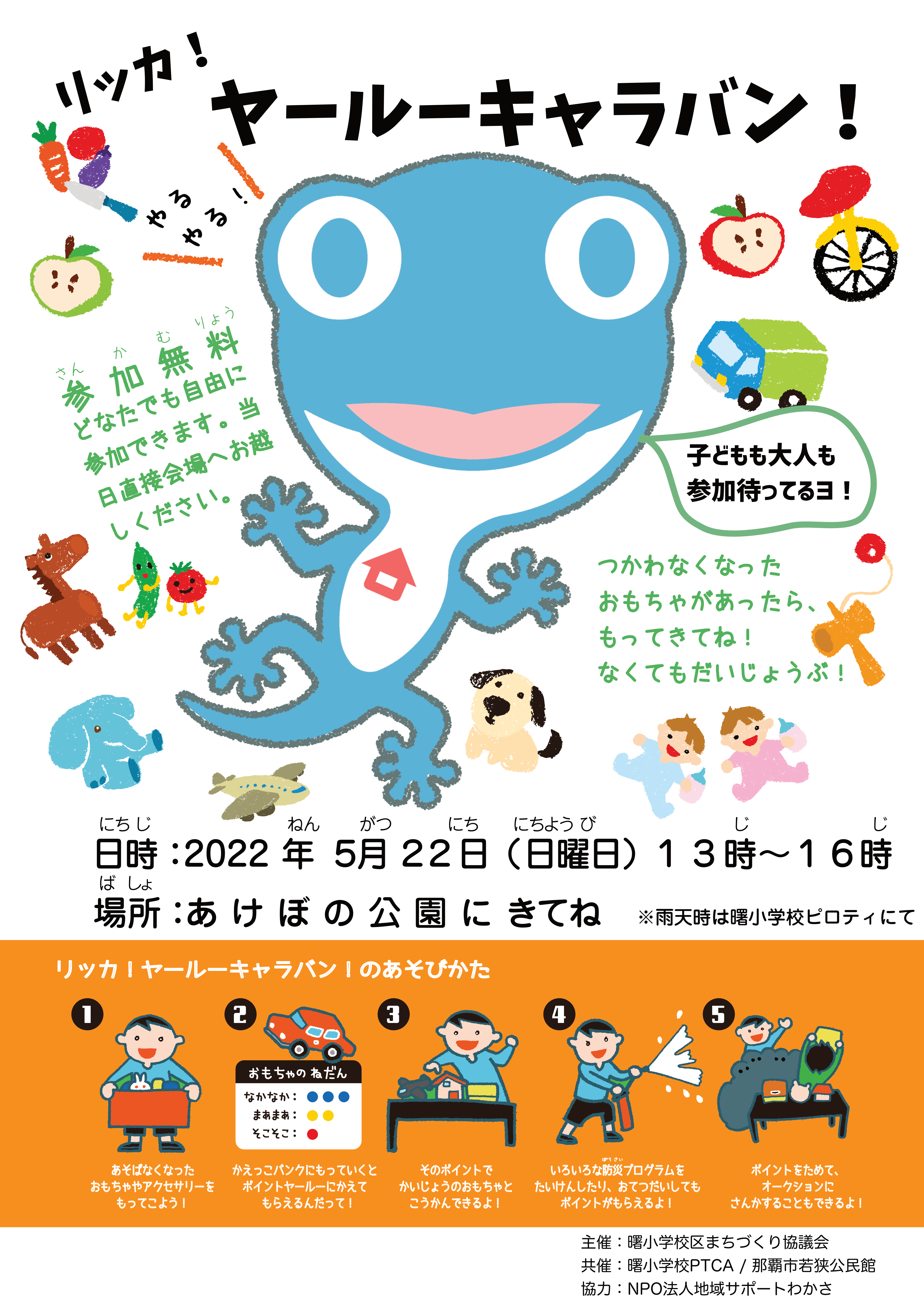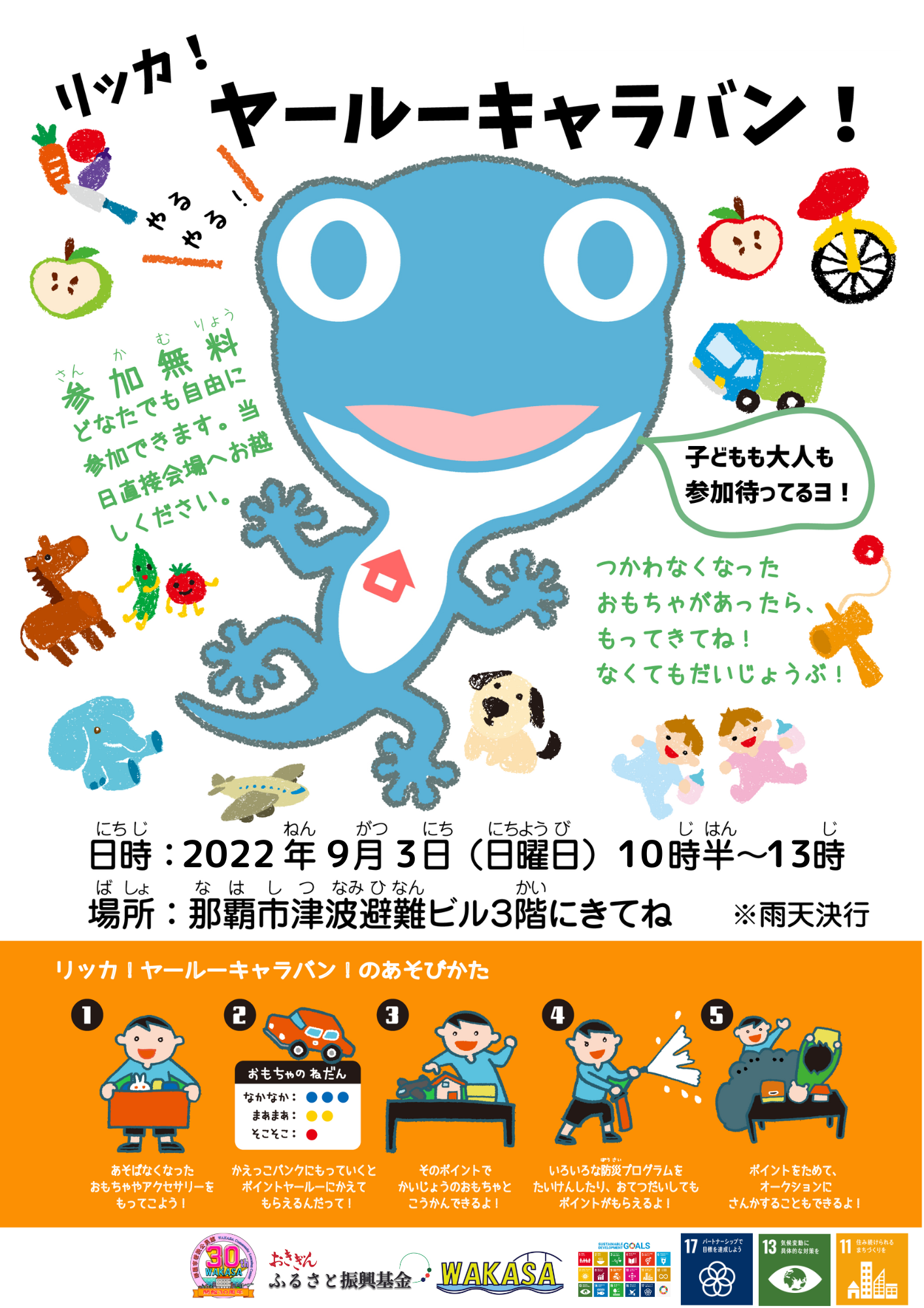 5月22日(日)に曙公園で「リッカ!ヤールーキャラバン!」を開催しました。 地域の防災訓練プログラムとおもちゃの交換会「かえっこバザール」を組み合わせた防災イベント『イザ!カエルキャラバン!』の沖縄版として開発した「リッ...