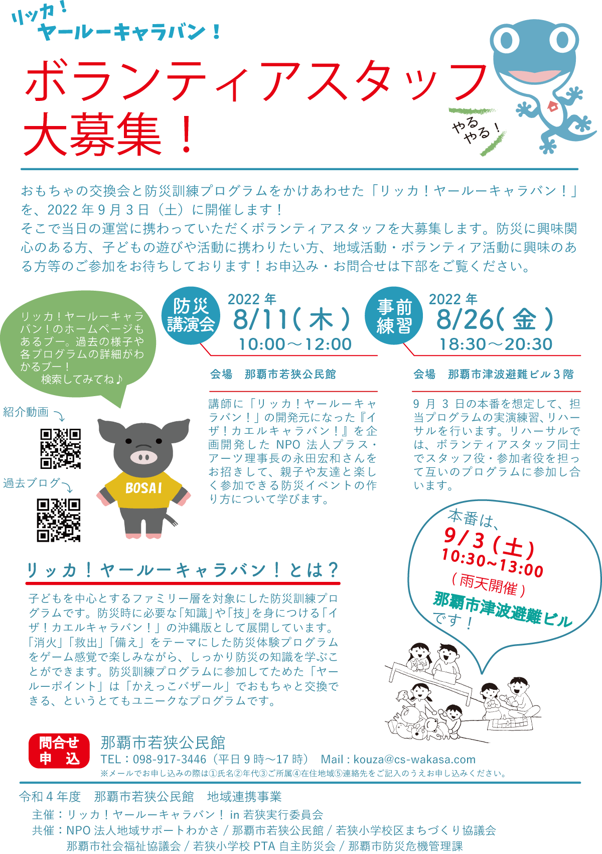 2022年9月3日(土)におもちゃの交換会と防災訓練プログラムをかけあわせた 楽しい防災訓練イベント「リッカ!ヤールーキャラバン!」を、開催します! 今回、初めてボランティアスタッフに参加する方々も多いことから、急遽オン...