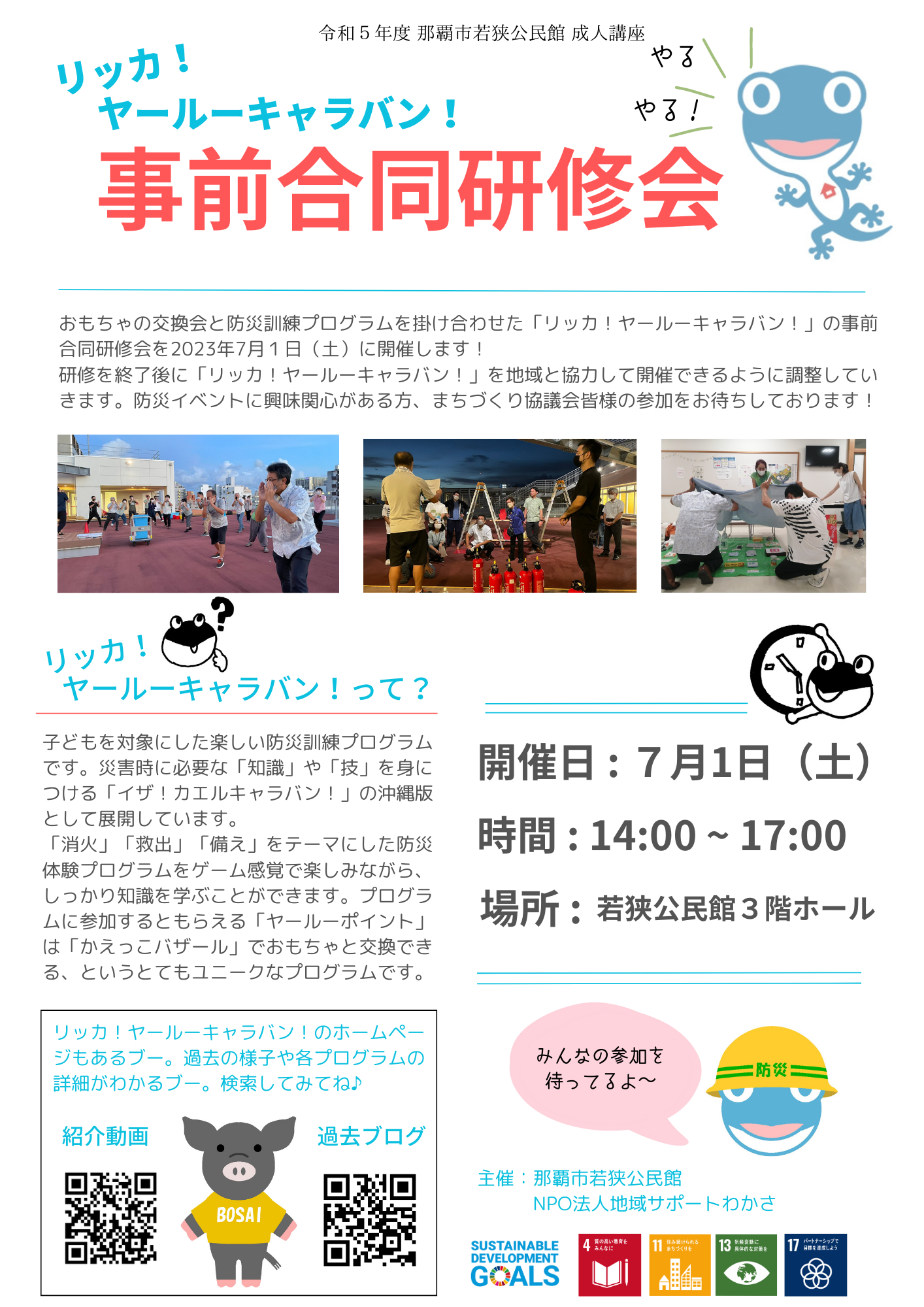 7月1日(土)にリッカ!ヤールーキャラバン!事前合同研修会を若狭公民館ホールにて開催しました! 地域や自治体でリッカ!ヤールーキャラバン!や防災イベントで地域づくりに取り組みたいと思っている方々が参加してく...