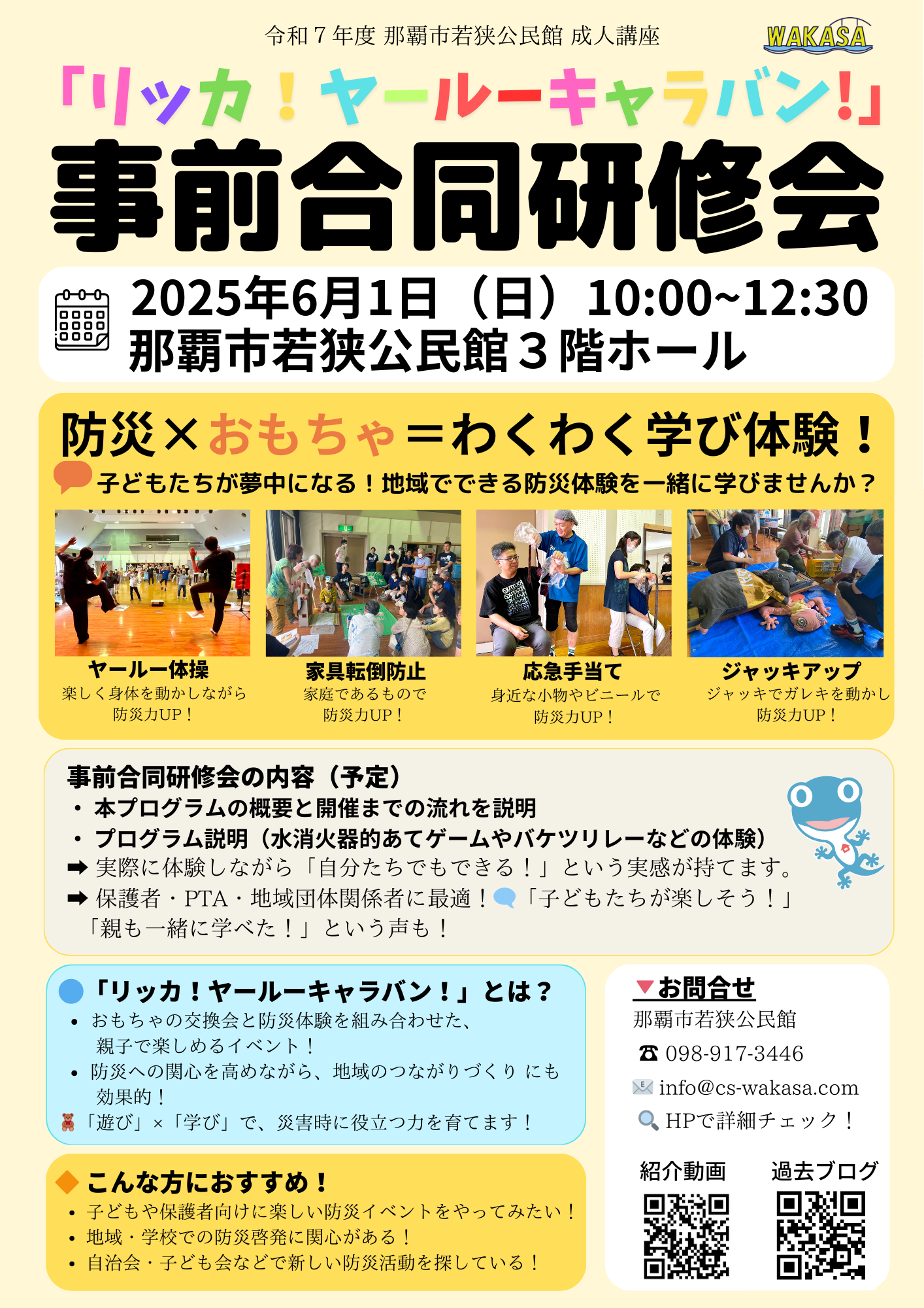 2025年6月1日(日)、若狭公民館3階ホールにて、 **「リッカ!ヤールーキャラバン!事前合同研修会」**を開催しました! 🌟 子どもたちが夢中で防災を学べる体験型プログラムとして開催しています。 これ...