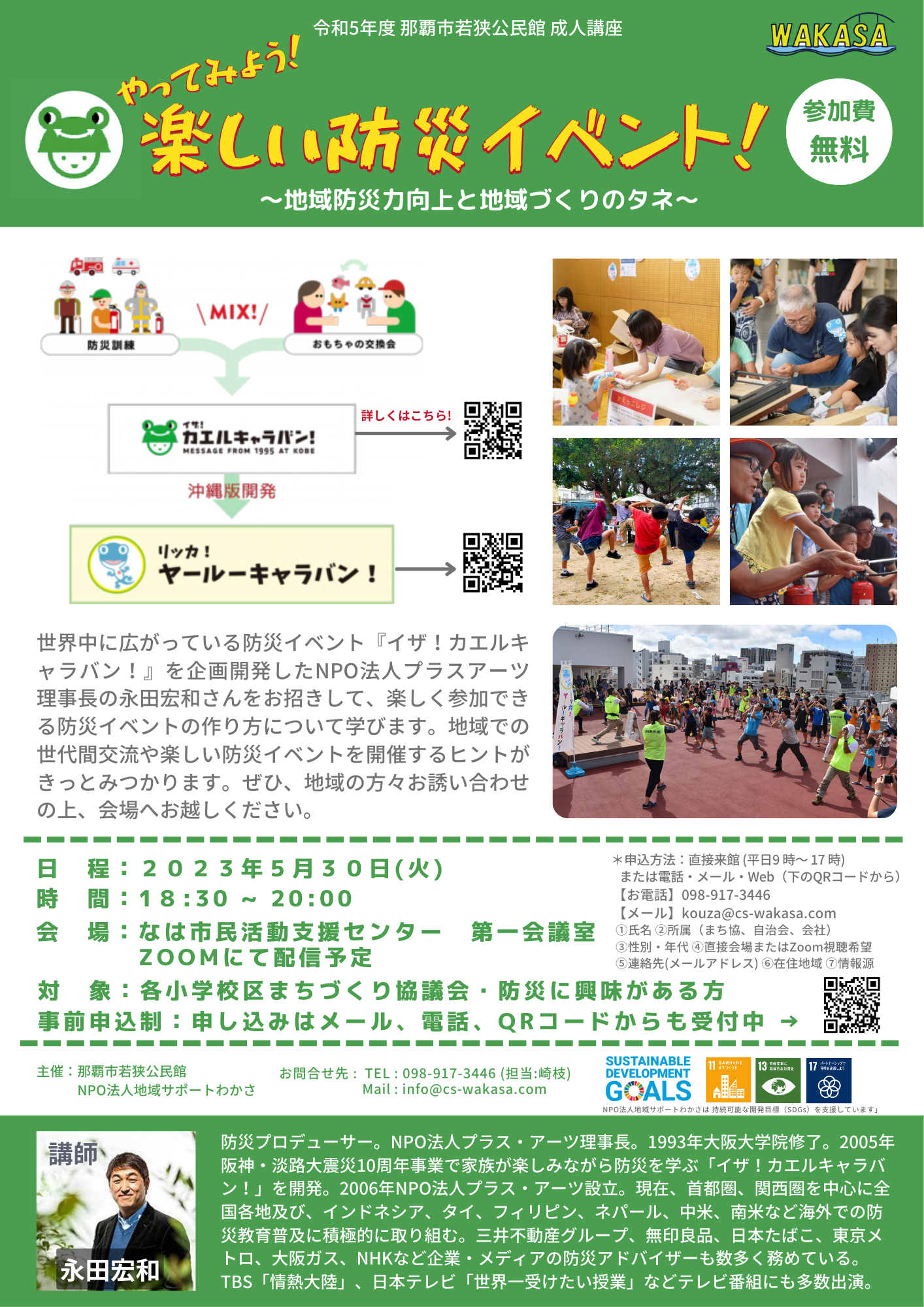 自然災害が多発する昨今、沖縄においても、地震等の災害はいつやってくるかわかりません。世界中に広がっている防災イベント『イザ!カエルキャラバン!』を企画開発したNPO法人プラスアーツ理事長の永田宏和さんをお招きして、楽しく...